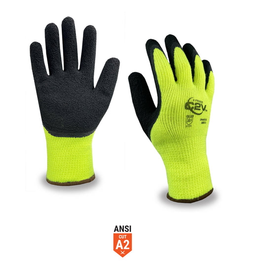 X-FREEZE, HiViz Green 7 Gauge Brushed Loop In Acrylic Terry Shell, Black Foam Latex Palm, ANSI Cut A2