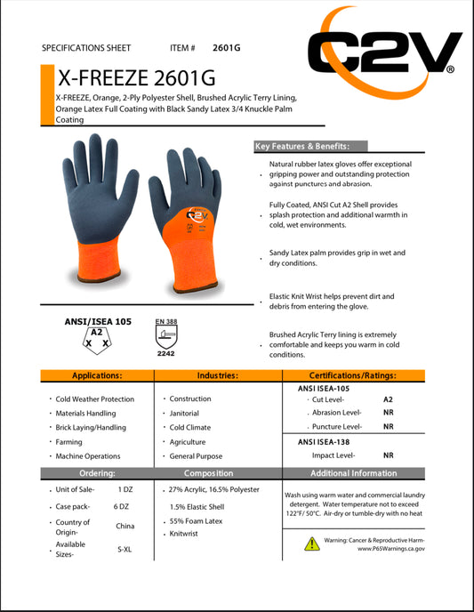 X-FREEZE, Orange Polyester Shell, Brushed Acrylic Terry Lining, Full Latex Coat w 3/4 SN Back, ANSI Cut A2